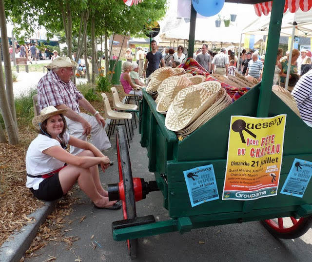 Quessoy, not far from here, where I shop and pass through often, used to be famed for its straw hats, preferred by its inhabitants to the traditional black Breton felt ones. This year, it was decided to commemorate this with a straw hat festival. The wearing of straw hats was de rigueur - and on such a day not at all a bad idea - and if you didn't have one you could buy one for a Euro-fiver from this jolly young woman and her jolly barrow, which we did.