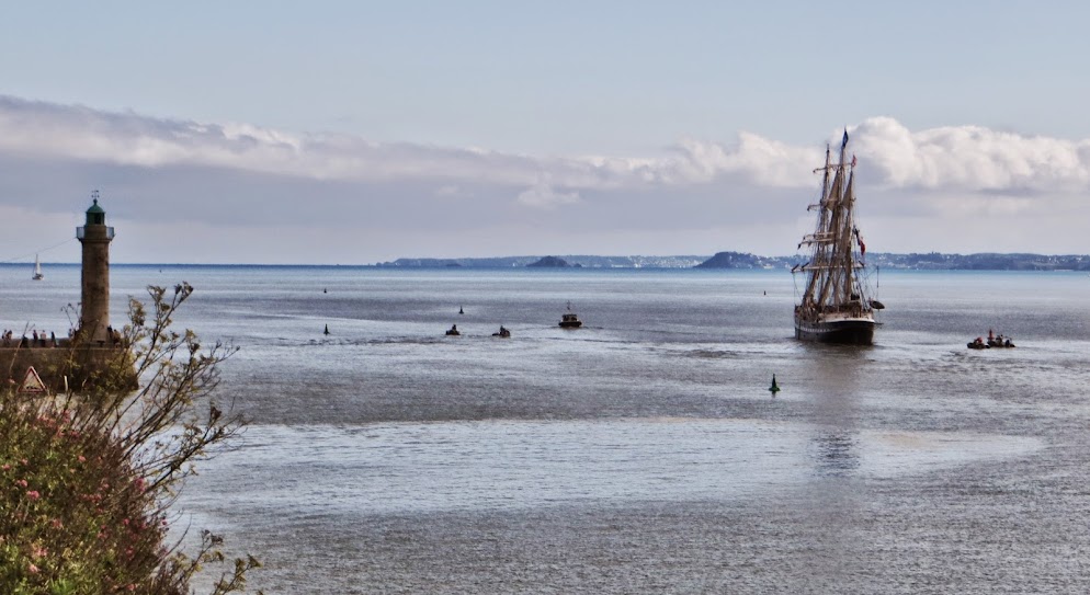 At this point I rested the camera on the railing, and so was able to take a fairly steady video of her passing. This is about two and a half minutes and unless you're very interested in seeing a big boat chugging out of a river mouth in northern Brittany, I would recommend drying paint as an equally fascinating visual spectacle, but I did spend about two hours hogging the big computer and uploading it to Youtube (it's quite good definition) so I feel I want to get my money's worth out of it and am embedding it here. There are a number of motor bikes and other engines racketing away in the background, but the high point comes near the end when they hoist up some of the foresails and there's a riveting bit of dialogue which goes thus: